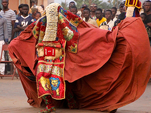 La aparición de Egungun en una comunidad está invariablemente acompañada de pompa y pompa, tambores y bailes, cantos y celebraciones. El festival que sigue se prolonga durante varios días y fortalece los lazos que unen a las familias y comunidades con antepasados fallecidos. Los trajes están construidos con telas dispares, tanto tejidas localmente como fabricadas industrialmente, además de cuentas de metal, cuero, huesos y potentes materiales empoderadores. Hoy en día, las telas elegidas son literalmente las mejores que el dinero puede comprar e incluyen damasco, terciopelo, seda, madrás india y algodón estampado. Estas representaciones de máscaras a menudo van acompañadas de remolinos de telas y colores, aumentadas por intrincados movimientos corporales y pasos de baile cuidadosamente orquestados. En el mejor de los casos, Egungun es a la vez un desfile fantasioso y una manifestación concreta de las exhibiciones acrobáticas del espíritu en movimiento.... ÀSÉOO -